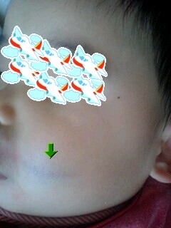 ほっぺに青タンなんて。。。どこでぶつけたんでしょうね?気付かないうちということは、ぶつけた時に泣かなかったってことですよね。 さくらさんへ