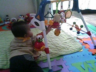 そんな息子も本日はお座りしてジムで遊び中 お座りして遊ぶ方が視野が広がって楽しいみたい