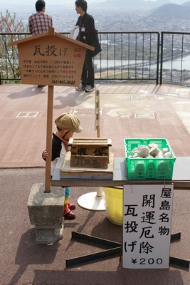 ![]() ![]() ![]() 毎度のことながら早すぎ~ ![]() さてさて昨日の続きです ![]() 屋島 には、水族館やお寺等があります ![]() まずは 四国八十八ヶ所巡り の八十四番札所の 屋島寺 を参拝 ![]() この鳥居は蓑山大明神。 家庭円満・縁結び・水商売の神様らしいです ![]() ![]() ![]() 家庭円満とか縁結びというだけあってか 左にはオス狸、右にはメス狸がおりました ![]() ![]() ![]() 下の写真をみてわかる通り、オス狸にはシンボルがついております(笑) メス狸は残念ながら写真はないのですが、片乳だけありました なぜ片乳だけ。。。 息子さんは鳥居を歩いたり、子狸に夢中 ![]() ![]() じいちゃんとおばちゃんとお水を触って楽しんだりもしてました ![]() ここで父と妹が登場したので、今回屋島に行ったメンバーをご紹介 ![]() って、いつも通りの旦那・私・息子・父・母・妹です ![]() ![]() ![]() この後、屋島名物かわら投げ~ ![]() ![]() ![]() 合戦に勝った源氏の将兵が陣笠を山上から投げて勝どきをあげた古事にならい、 小さな素焼きのカワラケを投げ飛距離を競うもので、屋島名物の一つ。 遠投力ではなく風にうまく乗せるのがコツ。 戦勝にちなみ、受験の合格祈願にも霊験があるとか。 父ちゃん、振りかぶって。。。 投げました~ ![]() 瓦見えるかなぁ? 写真の上の真ん中辺りの灰色の丸い物体がそうです ![]() なかなかの飛距離です(笑) 息子もみんな投げたので、これでみ~んな ![]() 開運厄除け![]() です![]() 屋島編は明日で終わります ![]() ではでは。。。