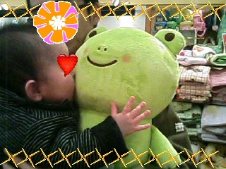 もうひとつはこのかえるのぬいぐるみ 息子よりもはるかにでっかいぬいぐるみでした またまた商品なのに息子はぬいぐるみを見るなり (-ω☆)キラリ ガブ~((ノ`O´)ノ