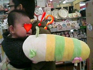 口の中にグーを突っ込んで ああああああああああ え"え"え"え"え"え"え" とでっかい声で叫びだすじゃありませんか!(`ロ´;) ず~っと唸ってるんです 息子は(´ー*`)と絶好調 父ちゃん・母ちゃん、息子の鳴り止むことのない唸りに失笑。。。 ヽ(´▽`;)/=3=3=3=3 へへへ~っ 笑うしかなかったです(笑) 唸りも数分でなんとか落ち着いたので、でっかいぬいぐるみが置いているお店に入りました この気持ち悪いぬいぐるみの口の中に息子の腕を突っ込んでみました 息子は腕をブンブン振って、この『なまこん3』というぬいぐるみ吹っ飛んじゃいました。。。 ~~~ (/´θ`)/ アーレー 商品なのにすみませぬ