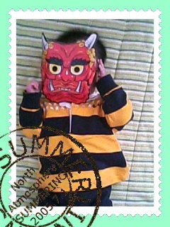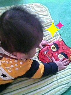 そして妙におとなしくなったなぁと思うと (゜ロ゜;)エェッ!? お面についていた輪ゴムを食ってました (∇ ̄= )ニヤ♪ なぜそんな顔!? このまま息子にお面を渡しておくと、悲惨なことになりかねないので、このあとすぐ奪い取りました 息子よ、あと数時間後には一緒に豆まきしようね